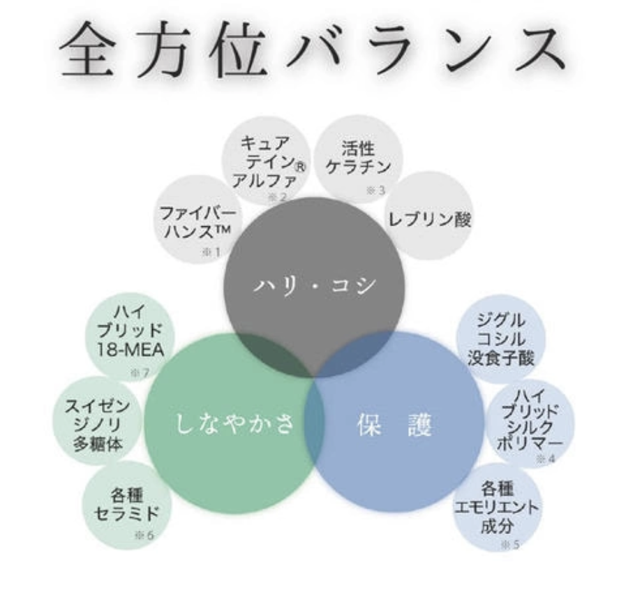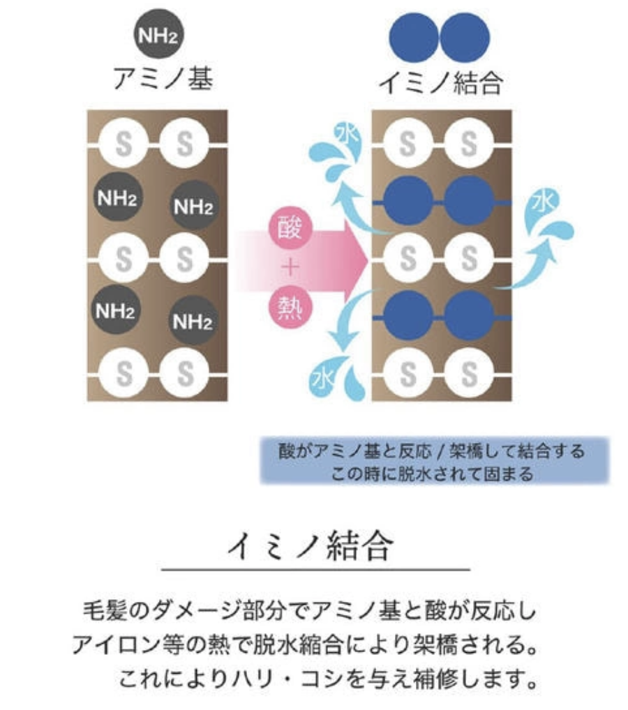 イミノ結合と呼ばれる反応を利用して、髪のダメージ部分を修復しハリコシをアップさせていきます。