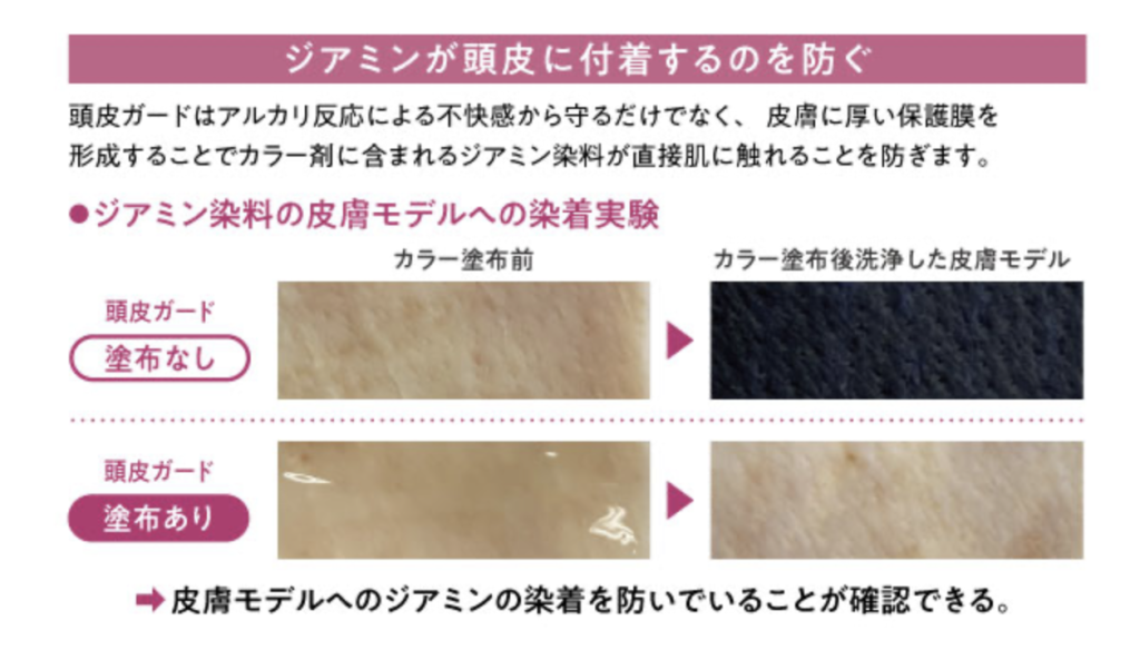 こちらをカラーリング前に頭皮へ塗布することにより、頭皮にかゆみ、痛み、発疹、腫れなどの皮膚症状の原因であるジアミンが付着するのを防ぎます。